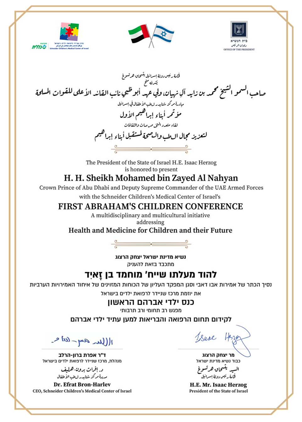 The invitation to the First Abraham’s Children Conference was presented to the Crown Prince of Abu Dhabi as a gift from the President of the State of Israel, Yitzhak Herzog, during his presidential visit to the UAE: