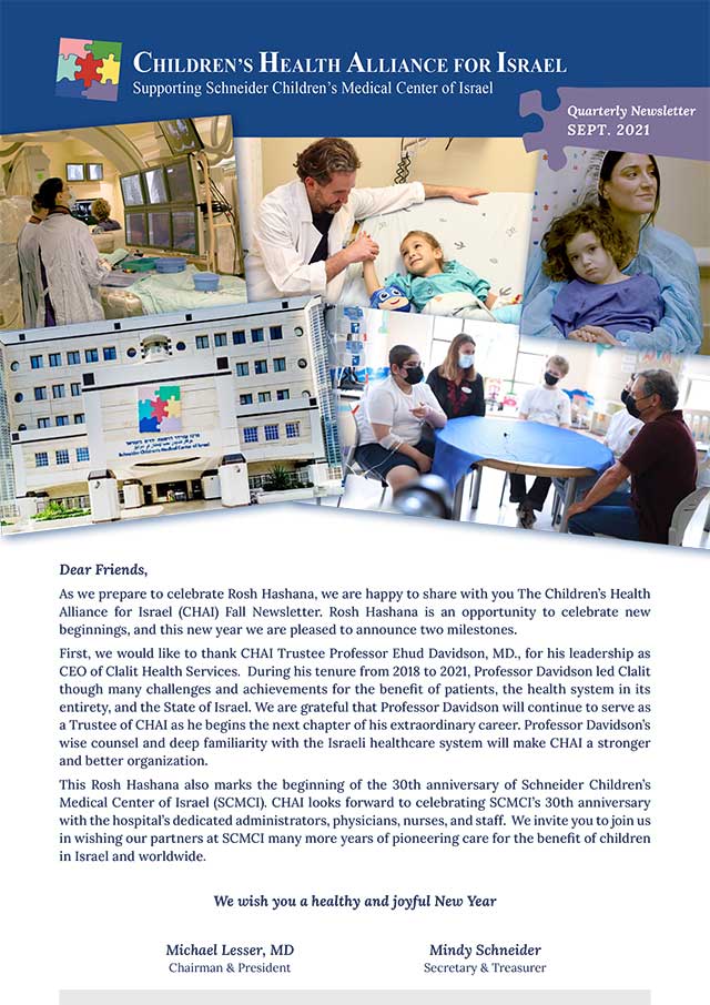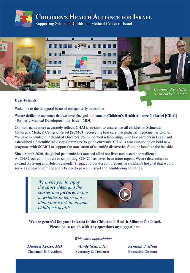 Welcome to the inaugural issue of our quarterly newsletter!We are thrilled to announce that we have changed our name to Children’s Health Alliance for Israel [CHAI]– formerly Medical Development for Israel [MDI]Our new name more accurately reflects CHAI’s mission: to ensure that all children at Schneider Children’s Medical Center of Israel [AFS] receive the best care that pediatric medicine has to offer. We have expanded our Board of Directors, re-invigorated relationships with key partners in Israel, and established a Scientific Advisory Committee to guide our work. CHAI is also embarking on bold new programs with AFS to support the translation of scientific discoveries from the bench to the bedside.Since March 2020, the global pandemic has touched all of our lives and tested our resilience. At CHAI, our commitment to supporting AFS has never been more urgent. We are determined to expand on Irving and Helen Schneider’s legacy to build a comprehensive children’s hospital that would serve as a beacon of hope and a bridge to peace in Israel and neighboring countries.